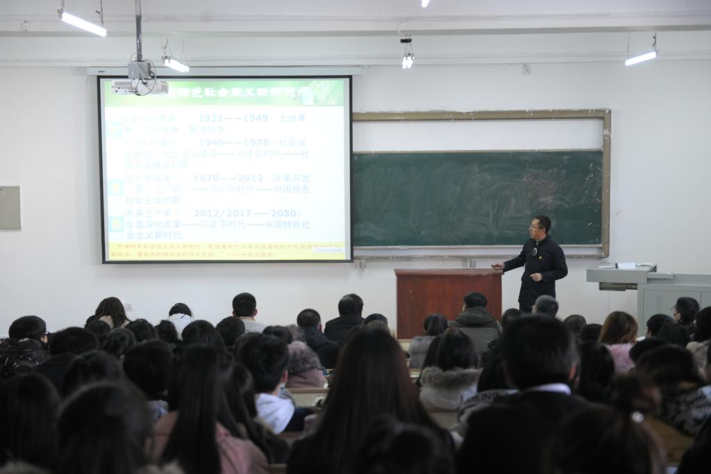 在東區(qū)25教階梯302教室,校黨的十九大精神宣講團(tuán)成員、馬克思主義學(xué)院中國近現(xiàn)代史綱要教研部主任、碩士生導(dǎo)師張春波副教授以《新思想引領(lǐng)新時代新使命開啟新征程》為題,從新時代、新矛盾——進(jìn)行偉大斗爭,新理論、新思想——建設(shè)偉大工程,新任務(wù)、新舉措——推進(jìn)偉大事業(yè),新使命、新征程——實現(xiàn)偉大夢想等四個方面闡釋了黨的十九大的“新”。他指出,只有進(jìn)行新的偉大斗爭才能開創(chuàng)新時代,解決新矛盾。只有以馬克思主義中國化最新成果——習(xí)近平新時代中國特色社會主義思想為行動指南,才能建設(shè)新的偉大工程。他分析了推進(jìn)中國特色社會主義偉大事業(yè)的新任務(wù)和新舉措,提出在實現(xiàn)中華民族偉大復(fù)興中國夢的新征程中廣大師生的使命擔(dān)當(dāng)。經(jīng)濟(jì)與管理學(xué)院全體教職工、學(xué)生黨員及入黨積極分子參加了宣講活動。
