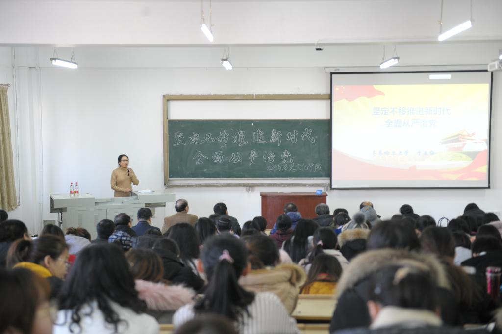 在東區(qū)25教階梯301教室,校黨的十九大精神宣講團(tuán)成員、馬克思主義學(xué)院副院長、碩士生導(dǎo)師于春梅教授以《堅定不移推進(jìn)新時代全面從嚴(yán)治黨》為題,從充分認(rèn)識五年來全面從嚴(yán)治黨的重大成就、明確新時代全面從嚴(yán)治黨的總體要求、全面把握黨的十九大對新時代全面從嚴(yán)治黨的新部署等方面,對黨的十九大精神進(jìn)行了系統(tǒng)、全面、深入的講解。于春梅指出,中國特色社會主義進(jìn)入新時代,面臨新環(huán)境新挑戰(zhàn)新問題,打鐵必須自身硬,因此必須堅定不移推進(jìn)新時代全面從嚴(yán)治黨這一偉大工程,必須進(jìn)一步把我們黨建設(shè)好、建設(shè)強(qiáng),使我們黨成為堅強(qiáng)有力的領(lǐng)導(dǎo)力量,從而決勝全面建成小康社會、奪取新時代中國特色社會主義偉大勝利。文學(xué)與歷史文化學(xué)院全體教職工、學(xué)生黨員及入黨積極分子參加了宣講活動。