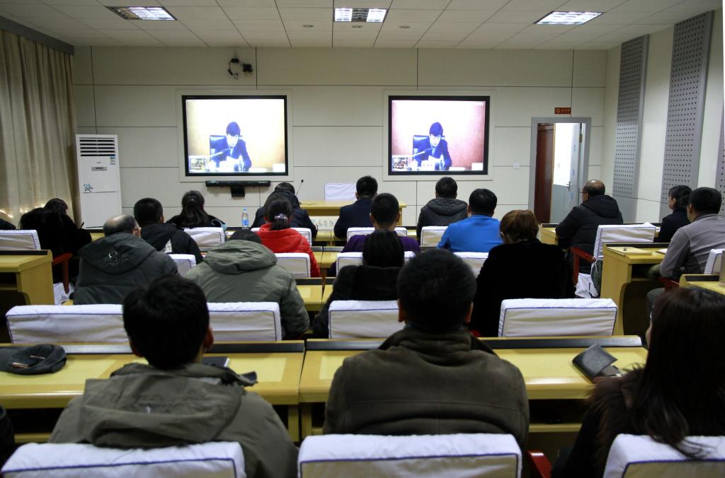 我校在西區(qū)主樓六樓遠(yuǎn)程視頻會議室設(shè)立分會場,校黨委書記蘭景力、副校長王剛以及宣傳統(tǒng)戰(zhàn)部、學(xué)生處、團(tuán)委、招生就業(yè)處、研究生部、學(xué)院主管就業(yè)工作領(lǐng)導(dǎo)、2018屆畢業(yè)生輔導(dǎo)員在分會場集體收聽收看了視頻會議。
