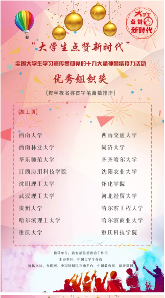 近日,由教育部思想政治工作司指導(dǎo),中國大學(xué)生在線主辦的“大學(xué)生點贊新時代”全國大學(xué)生學(xué)習(xí)宣傳貫徹黨的十九大精神網(wǎng)絡(luò)接力活動已經(jīng)圓滿收官,我校在此次活動中獲得優(yōu)秀組織獎。