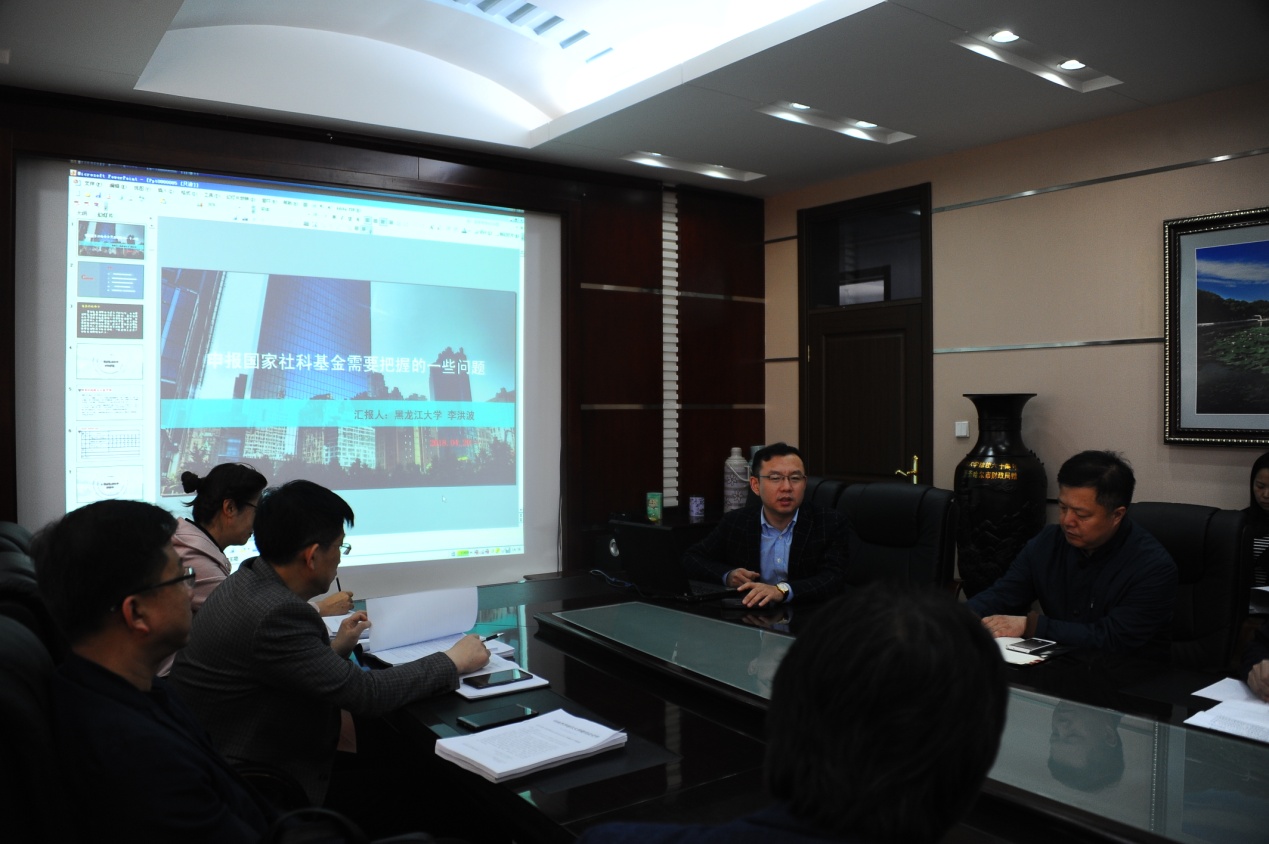 報(bào)告會(huì)上,李洪波教授從五個(gè)方面闡釋了關(guān)于申報(bào)國(guó)家社科基金項(xiàng)目需要把握的問題:一是國(guó)家社科基金評(píng)審流程及立項(xiàng)率;二是黑龍江大學(xué)申報(bào)國(guó)家社科基金的做法及經(jīng)驗(yàn);三國(guó)家社科基金申報(bào)的選題及注意事項(xiàng);四是關(guān)于申報(bào)書填寫的有關(guān)技巧;五是文科科研頂層設(shè)計(jì)、謀劃措施及繁榮計(jì)劃。
