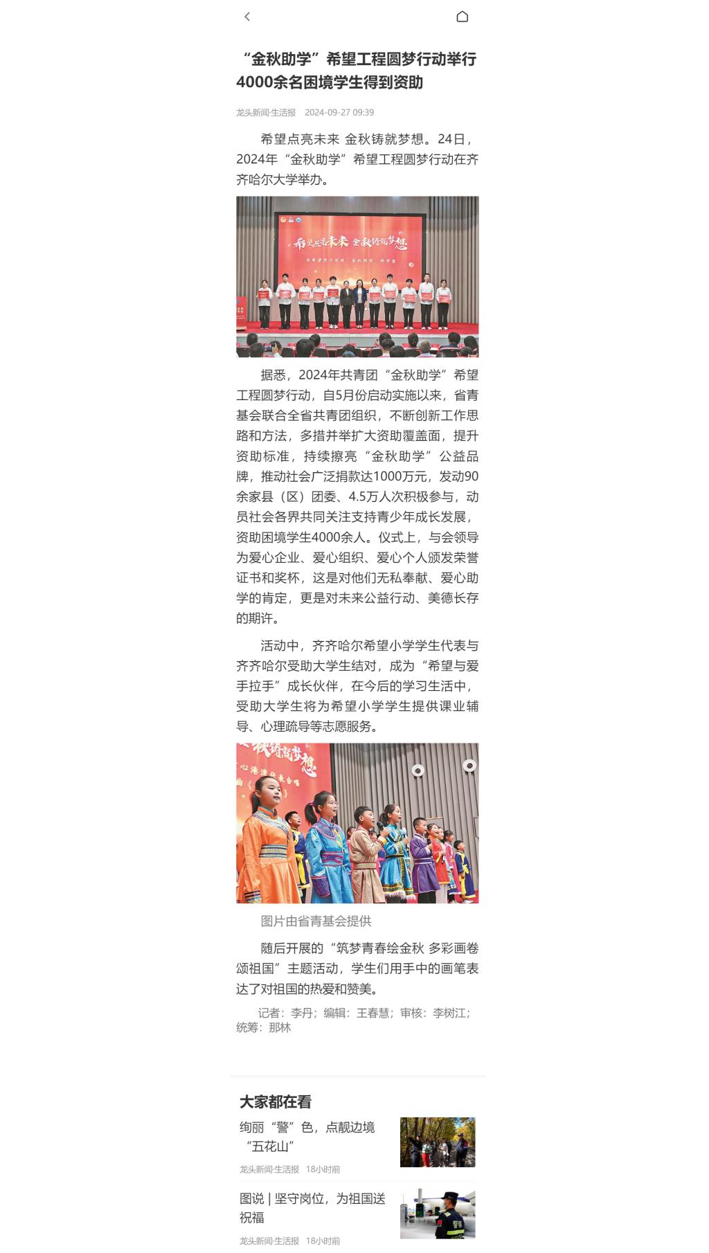 下一條:【龍頭新聞·黑龍江日?qǐng)?bào)】“金秋助學(xué)”希望工程圓夢(mèng)行動(dòng)舉行 4000余名困境學(xué)生得到資助