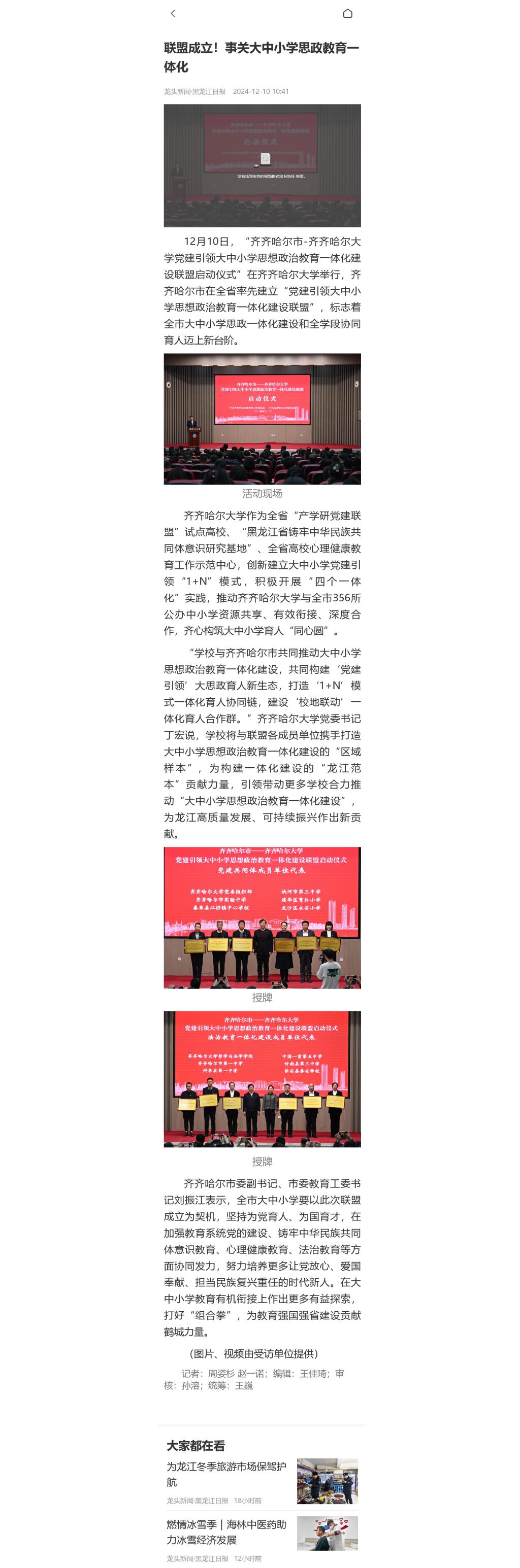 下一條:【龍頭新聞·黑龍江日?qǐng)?bào)】齊齊哈爾市—齊齊哈爾大學(xué)黨建引領(lǐng)大中小學(xué)思想政治教育一體化建設(shè)聯(lián)盟啟動(dòng)