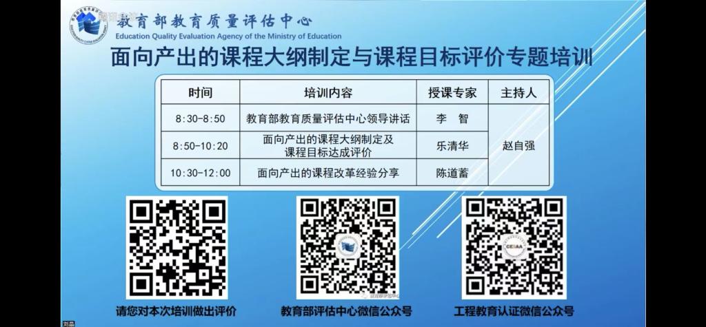 按照學(xué)校通知要求,為扎實推進(jìn)我院工程教育專業(yè)認(rèn)證工作,落實好教學(xué)課程大綱制定和課程目標(biāo)評價,我院組織全院教師于8月4日上午通過騰訊會議在線參加教育部教育質(zhì)量評估中心召開的專題培訓(xùn)。