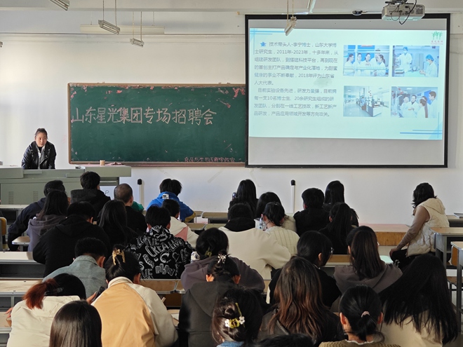 招聘會開始前,由我院食安系主任焦巖老師對星光集團進行介紹,讓我院學生了解到星光集團的創(chuàng)建背景以及發(fā)展情況。隨后,集團領導對其進行進一步的介紹。共分為五大塊企業(yè)簡介、晉升路線、薪資待遇、生活福利、崗位需求。該集團始終秉承誠信、拼搏、敬業(yè)、爭先的企業(yè)精神和誠信為本、質(zhì)量第一、用戶至上、造福社會的企業(yè)理念。自成立以來,積極構(gòu)建和實施了“三三一零”工程,重點發(fā)展三糖(蔗糖、生物糖、功能糖)、三儲(儲糖、儲糧、儲煤)、一熱(熱電聯(lián)產(chǎn))、零(吃干榨凈零排放),以大商貿(mào)推動大產(chǎn)業(yè)、大倉儲、大物流的配套運營模式,平均每一年創(chuàng)建一個新公司,每半年上一個新項目,創(chuàng)造了現(xiàn)實版的“星光速度”。 形成了集原糖加工、玉米深加工、熱電聯(lián)產(chǎn)、食糖儲備、保稅倉庫、物流商貿(mào)、新型建材、污水處理及功能糖科技開發(fā)等完善、高效的循環(huán)經(jīng)濟產(chǎn)業(yè)鏈條。招聘會尾聲,我院就業(yè)于山東星光集團的優(yōu)秀畢業(yè)生分享了自己在該集團的經(jīng)歷與感受,并為我院學生答疑解惑。最后,我院學生紛紛表示要提前做好就業(yè)規(guī)劃,積極就業(yè),堅定自己的理想目標,不斷為之奮斗,為今后的就業(yè)做好提前準備、積累寶貴經(jīng)驗。