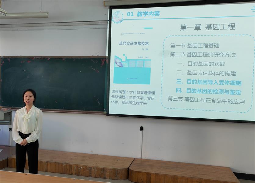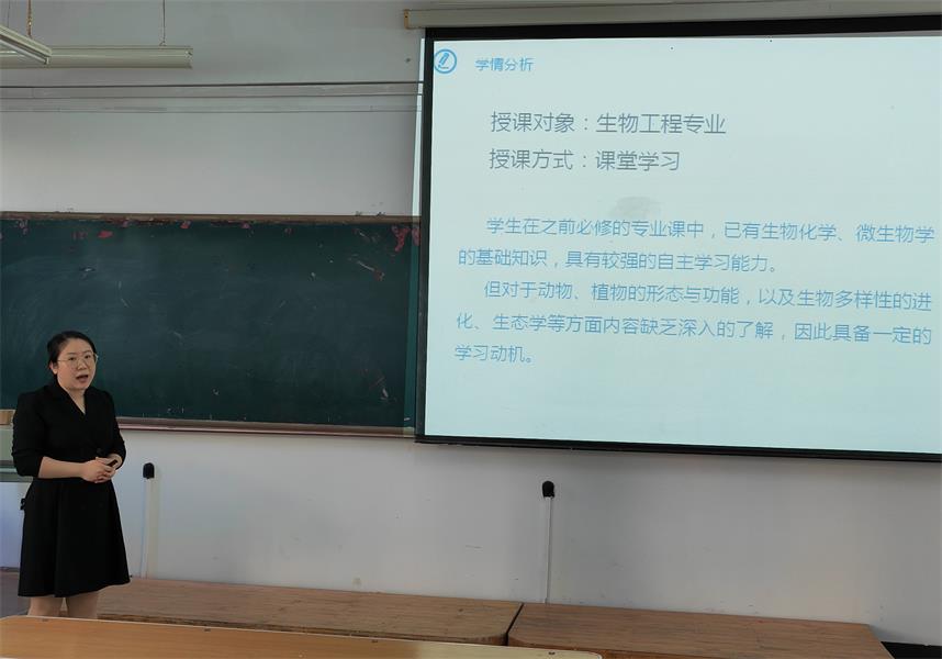 現(xiàn)場展示中,青年教師們飽含激情、循循善誘,以精彩的課堂設(shè)計、沉穩(wěn)從容的講授、師生間積極有效的互動設(shè)計贏得了評委的熱烈掌聲。食品科學(xué)與工程專業(yè)康佳欣老師講授“基因工程的研究方法”,介紹了目的基因?qū)胧荏w細胞的幾種方式以后目的基因的檢測和鑒定方法,積極調(diào)動學(xué)生參與課堂討論;生物工程專業(yè)楊系玲老師向大家講述了普通植物學(xué)中的頂端優(yōu)勢,深入淺出,現(xiàn)場效果良好。